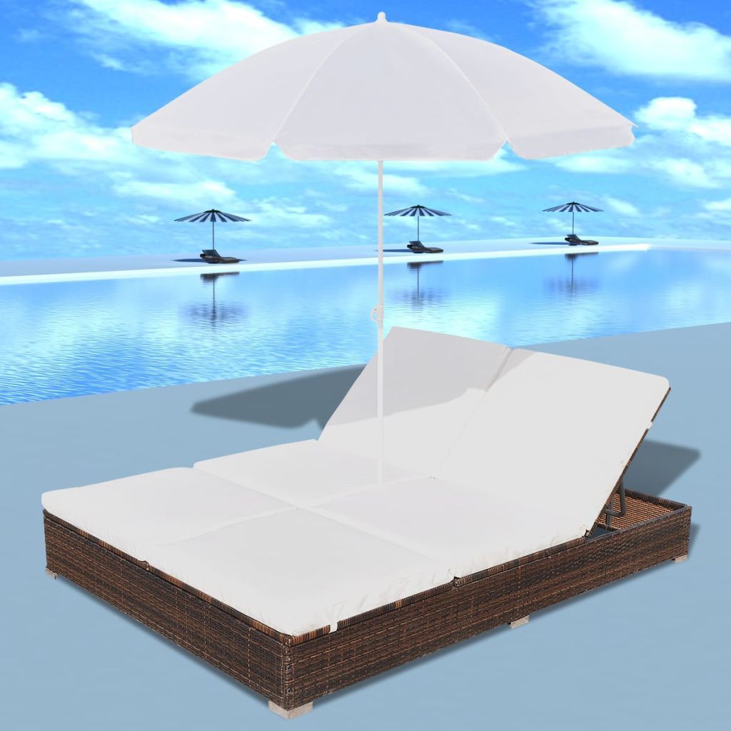 Sun Bed with Parasol & Cushions Poly Rattan Brown Sun Bed with Parasol & Cushions Poly Rattan Brown Sun Bed with Parasol & Cushions Poly Rattan Brown