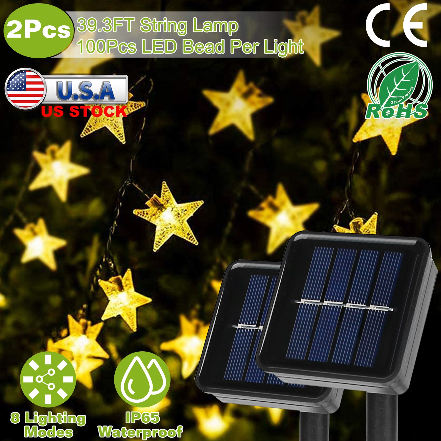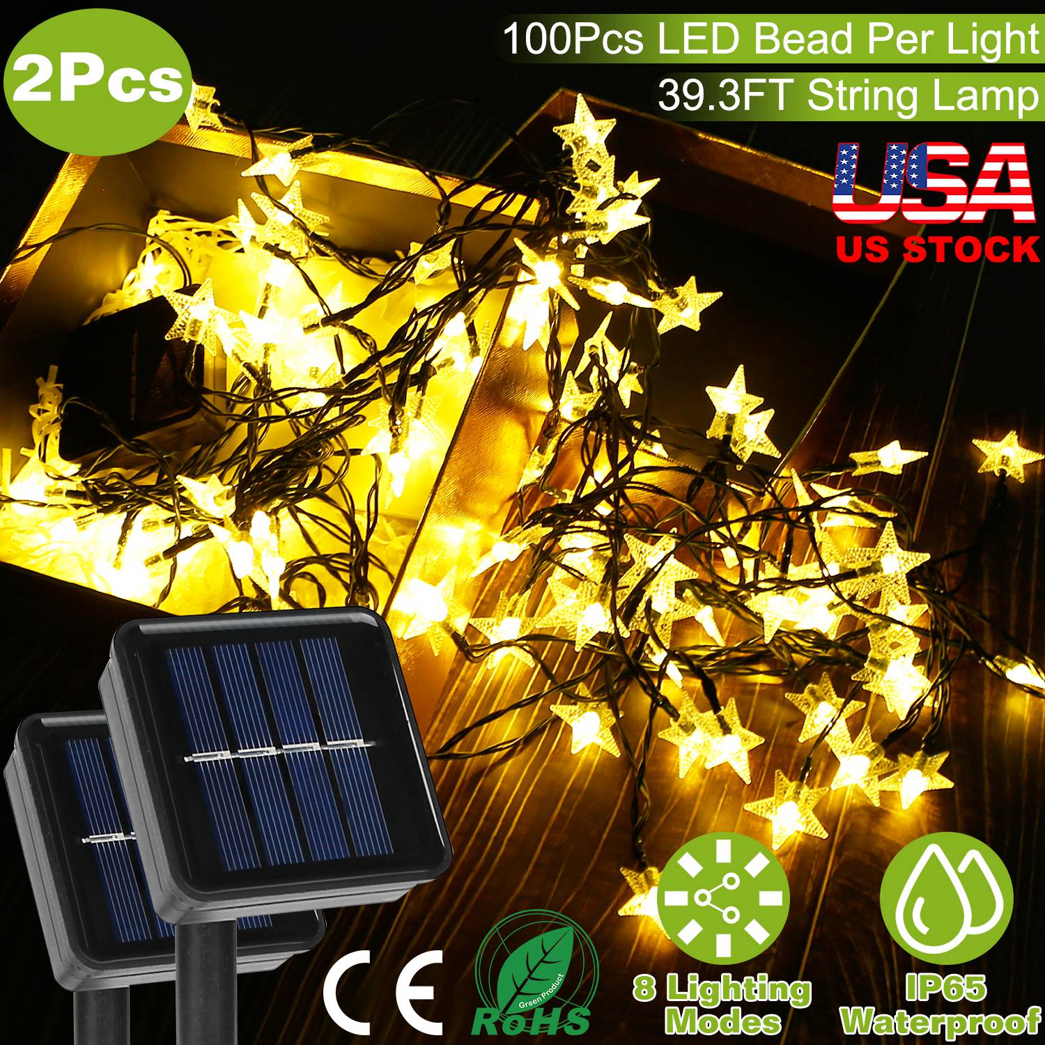 Home > 2Pcs Solar Powered String Lights 39.3FT 100LED Beads Fairy Star Lights IP65 Waterproof Decorative Garden Party Christmas Tree Stake Lamps w/ 8 Lightin