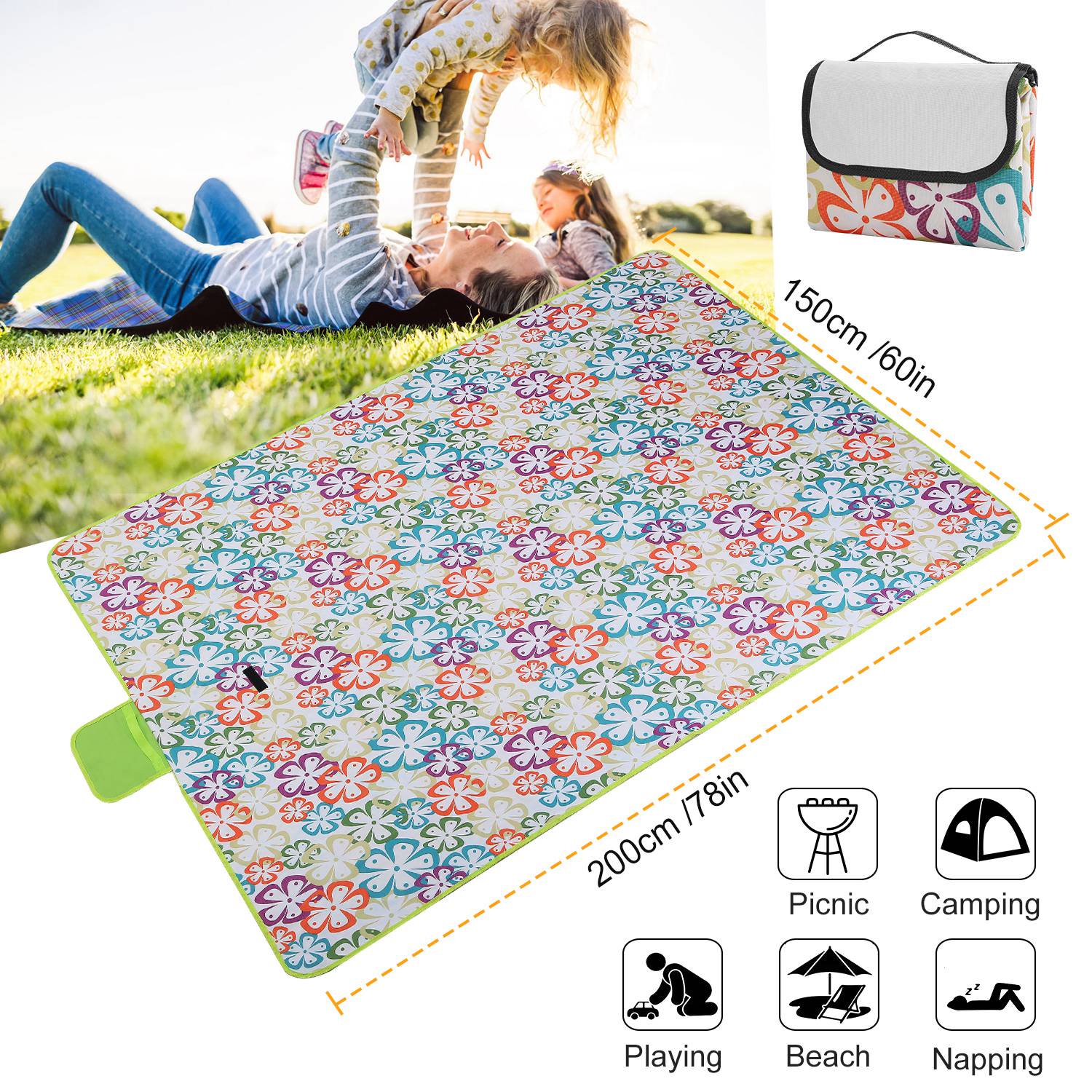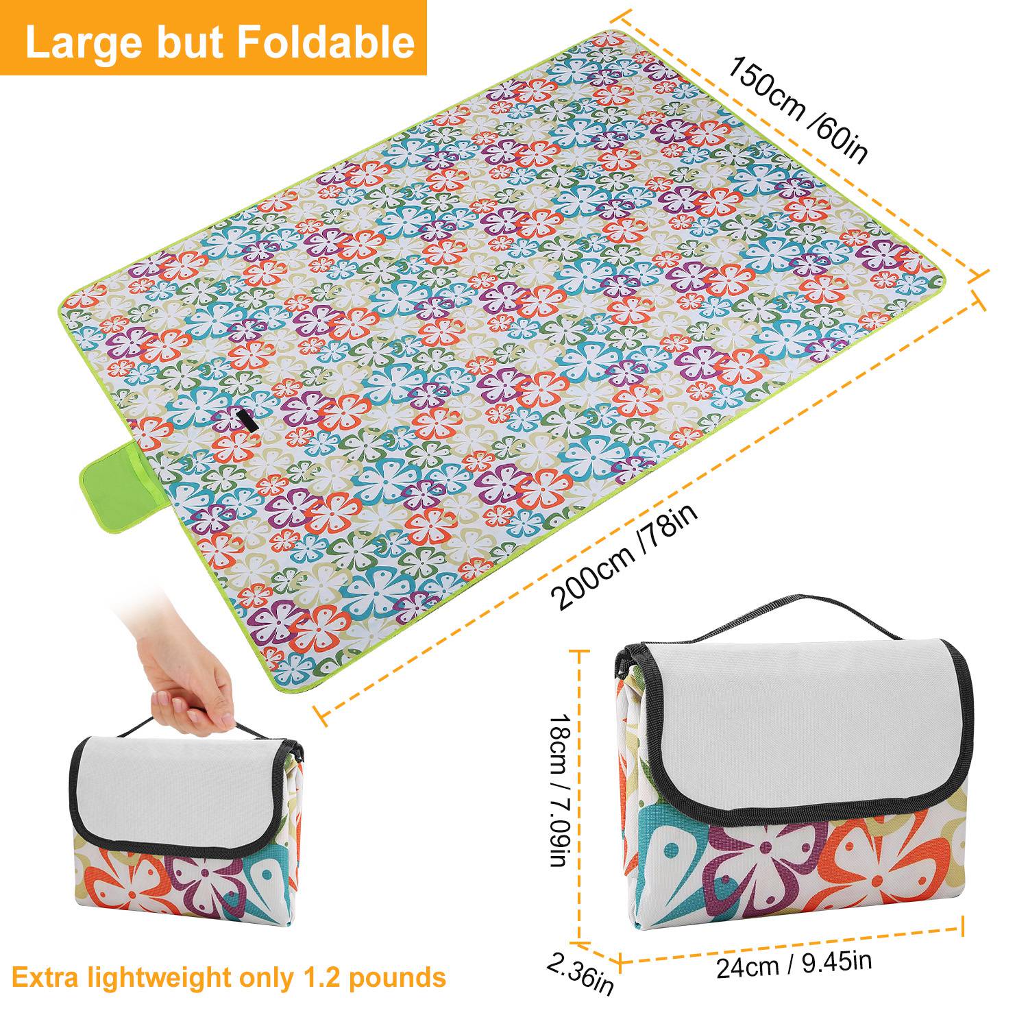 Our picnic blanket unfolds to 60" x 78", large enough to comfortably seat 4 adults and folds to a compact 10.5" x 15" for easy storage. The 600D Oxford is weather-proof and mold- and mildew-resistant. Built in a durable and convenient handle, weight only 1.2 pounds, portable and easily thrown in a backpack or travel bag. Perfect for picnic, camping, outing and beach travelling.