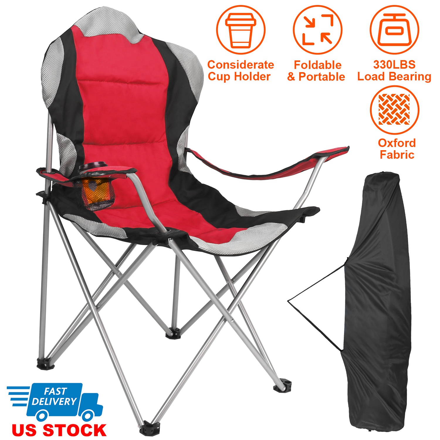 Home > Foldable Camping Chair Heavy Duty Steel Lawn Chair Padded Seat Arm Back Beach Chair 330LBS Max Load with Cup Holder Carry Bag