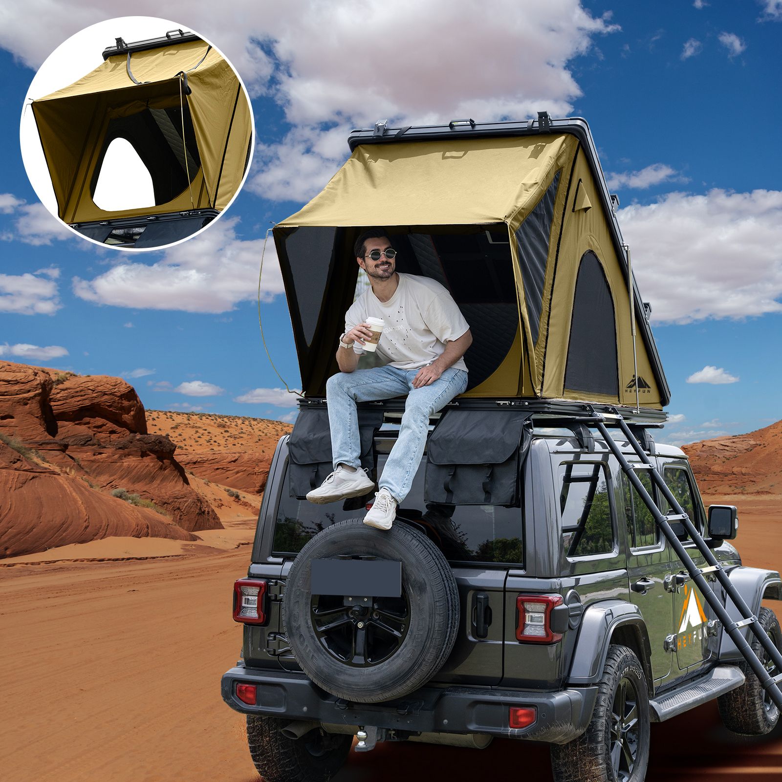 1. [Hardshell Rooftop Tent with Top Configuration 3 Layer Luxurious Mattress] - The suv car rooftop tent is designed with thick wear-resistant polyester, honeycomb aluminum hardshell with aluminium round corner, stainless steel gas struts, 3-layer built-in mattress, flocked lining tent floor, 13 interior ceiling&sidewall storage pouches and zipper netting windows, providing additional structural strength&rigidity, UV-resistant, waterproof, breathable and resistant to moisture.